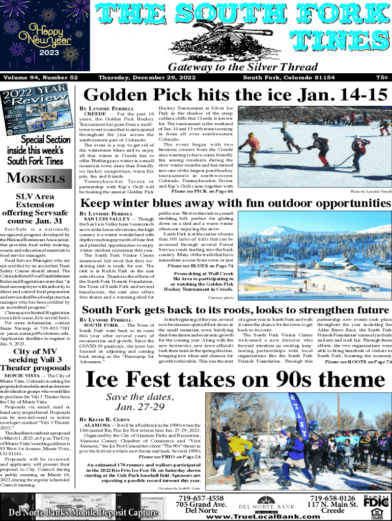 Gateway to the Silver Thread Volume 94, Number 52RYEA 2 2 2n0 view i Reaping. Valley Publishing Wed né SD, Dec ember 28, 20531 7198523Special Section inside this week\'s South Fork TinesMorsels SLV