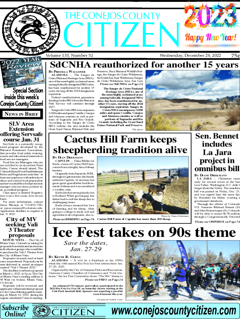 Volume 133, Number 52YEAR2n022view i Re VPinc.Valley Publishingay Wed ne sd, Dece mber 28, 20531 7198523Special Section inside this week\'s Conejos County Citizen! News iN Brief SLV Area Extension