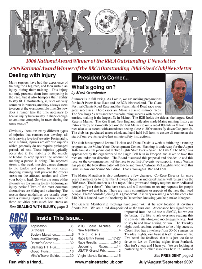 2006 National Award Winner of the RRCA Outstanding ENewsletter 2005 National Award Winner of the RRCA Outstanding (MidSized Club) Newsletter Dealing with Injury Many runners have had the experience
