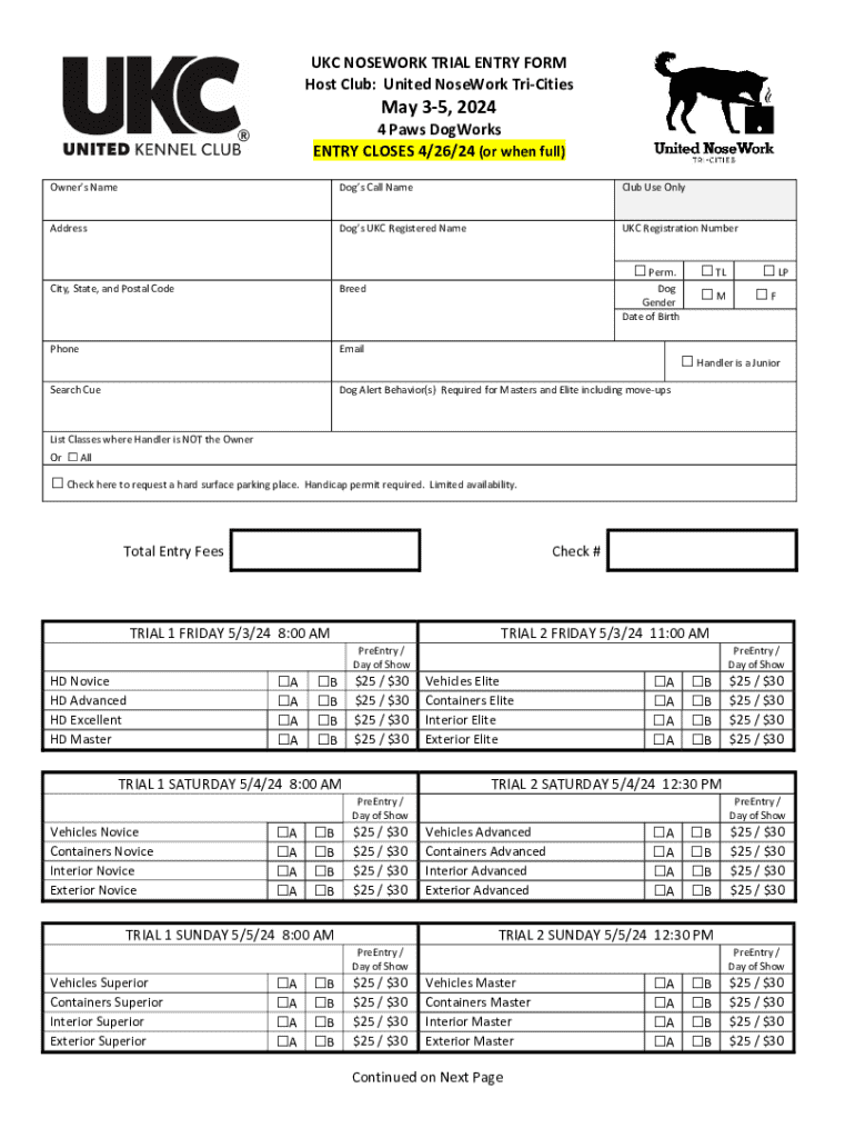 Anyone who wishes to participate in a nosework event or competition needs to fill out a nosework entry form.