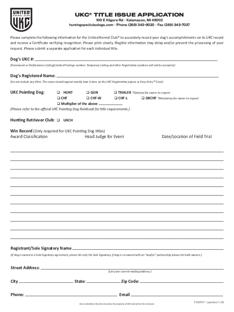 UKC TITLE ISSUE APPLICATION 100 E Kilgore Rd Kalamazoo, MI 49002 huntingops@ukcdogs.com Phone (269) 3439020 Fax (269) 3437037Please complete the following information for the United Kennel Club to