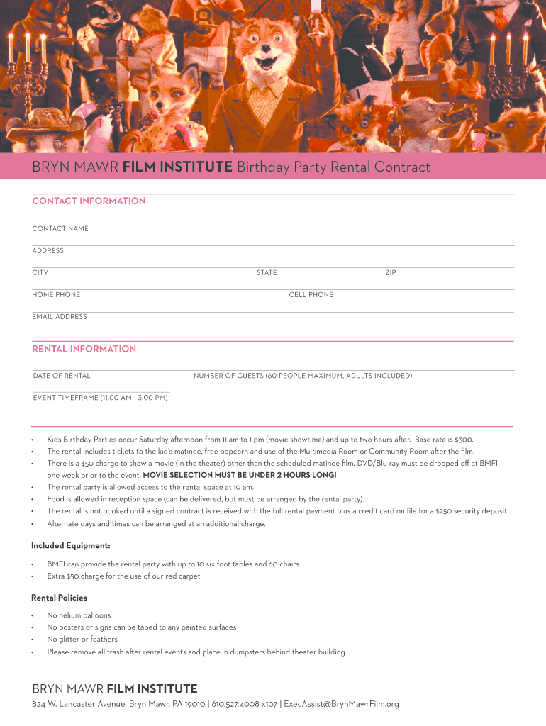 Get the free BRYN MAWR FILM INSTITUTE Birthday Party Rental Contract