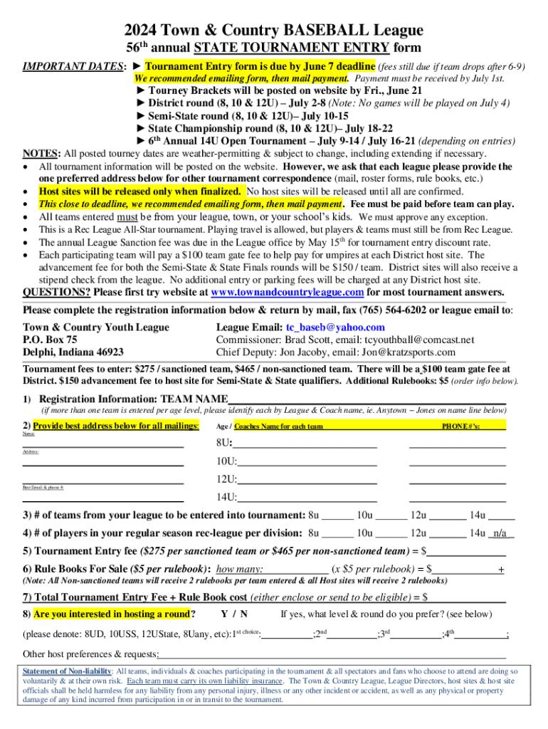 2024 Town & Country BASEBALL League 56th annual STATE TOURNAMENT ENTRY form IMPORTANT DATES: Tournament Entry form is due by June 7 deadline (fees still due if team drops after 69) We recommended