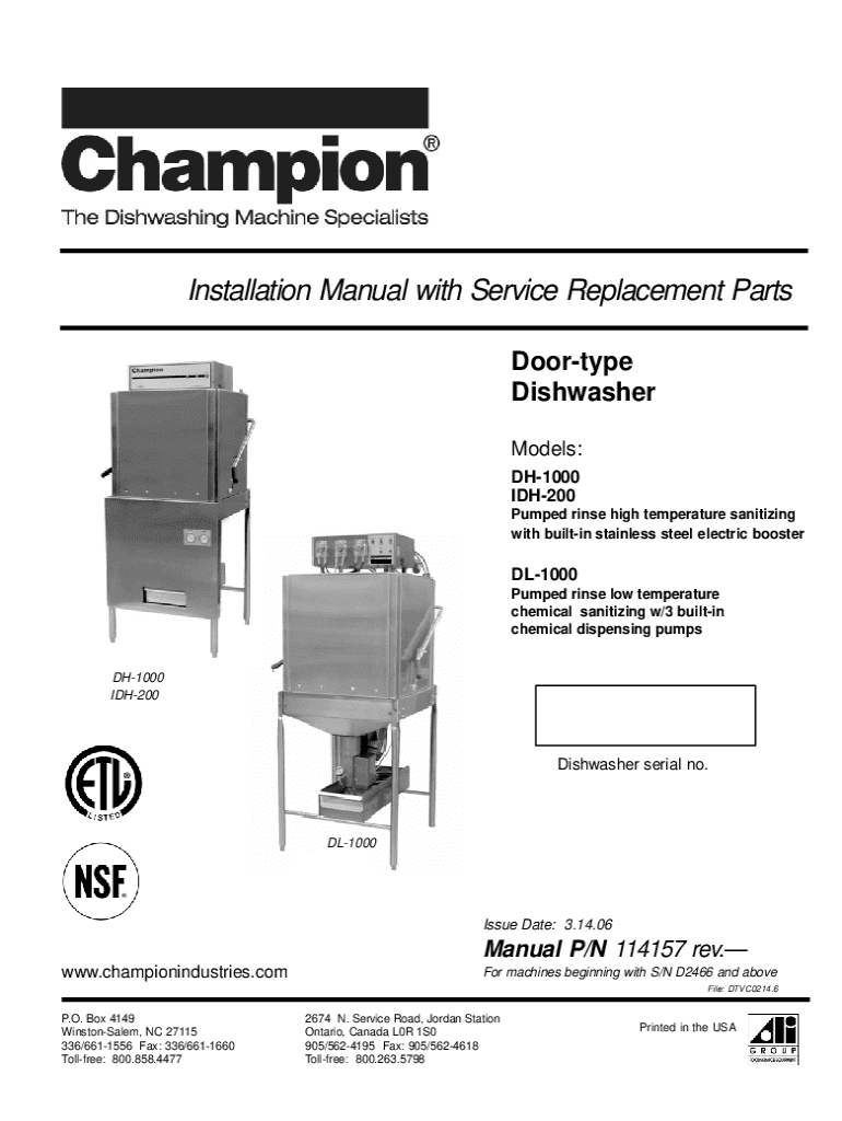 Installation Manual with Service Replacement Parts Door type Dishwasher Models: DH1000 IDH200 Pumped rinse high temperature sanitizing with built-in stainless steel electric boosterDL1000 Pumped rinse