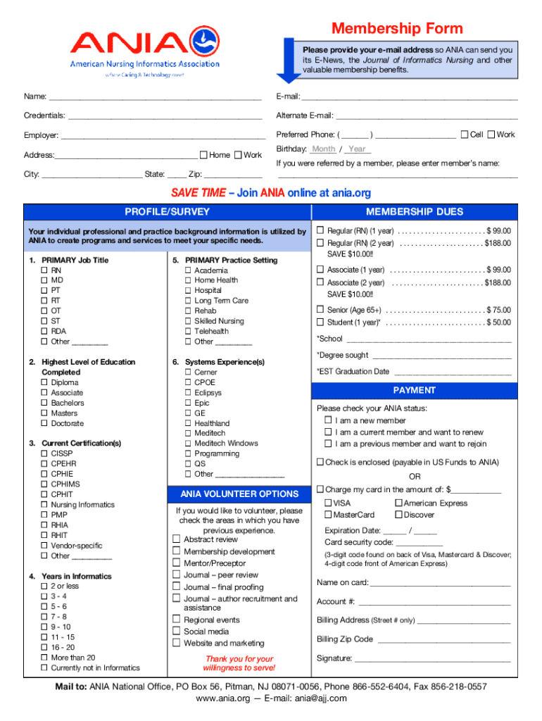 The ANIA membership application is a form that individuals can fill out to become a member of the American Nursing Informatics Association (ANIA).
