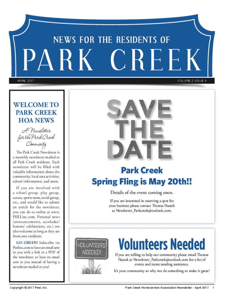 PARK CREEK NEWS FOR THE RESIDENTS FPA R K C R E E K APRIL 2017VOLUME 2, ISSUE 4WELCOME TO PARK CREEK HOA NEWSANewsletter for the Park Creek Community The Park Creek Newsletter is a monthly newsletter