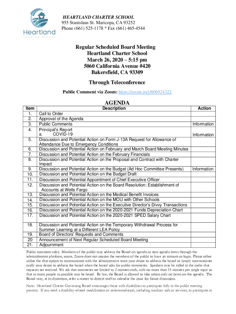 HEARTLAND CHARTER SCHOOL 955 Stanislaus St. Maricopa, CA 93252 Phone (661) 5251178 * Fax (661) 4654544Regular Scheduled Board Meeting Heartland Charter School March 26, 2020 5:15 pm 5060 California