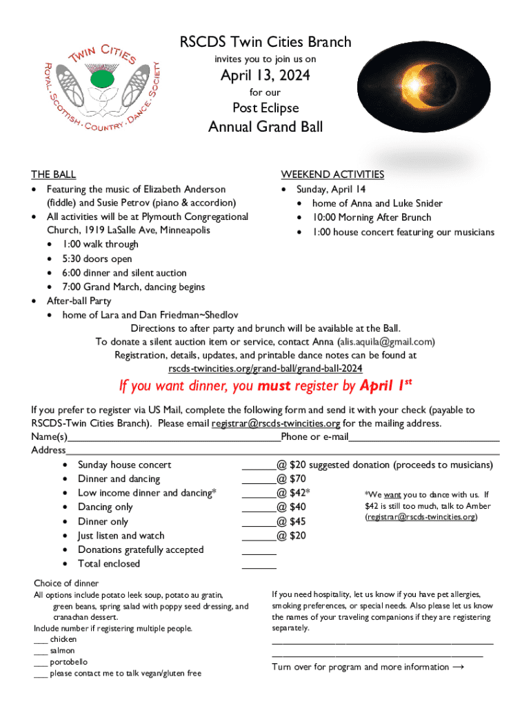 RSCDS Twin Cities Branch invites you to join us onApril 13, 2024 for ourPost EclipseAnnual Grand Ball THE BALL WEEKEND ACTIVITIES Featuring the music of Elizabeth Anderson Sunday, April 14 (fiddle)
