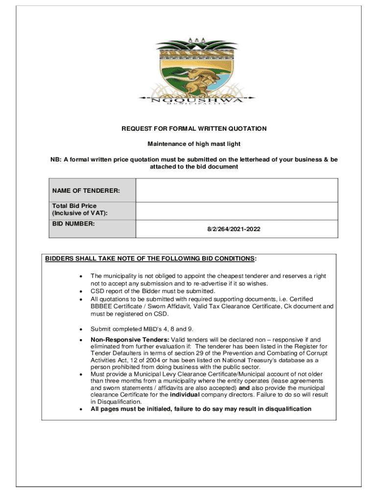 REQUEST FOR FORMAL WRITTEN QUOTATION Maintenance of high mast light NB: A formal written price quotation must be submitted on the letterhead of your business & be attached to the bid documentNAME