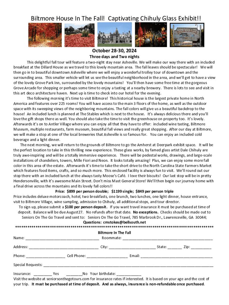 Biltmore House In The Fall! Captivating Chihuly Glass Exhibit!!October 2830, 2024Three days and Two nightsThis delightful fall tour will feature a twonight stay near Asheville. We will make our way