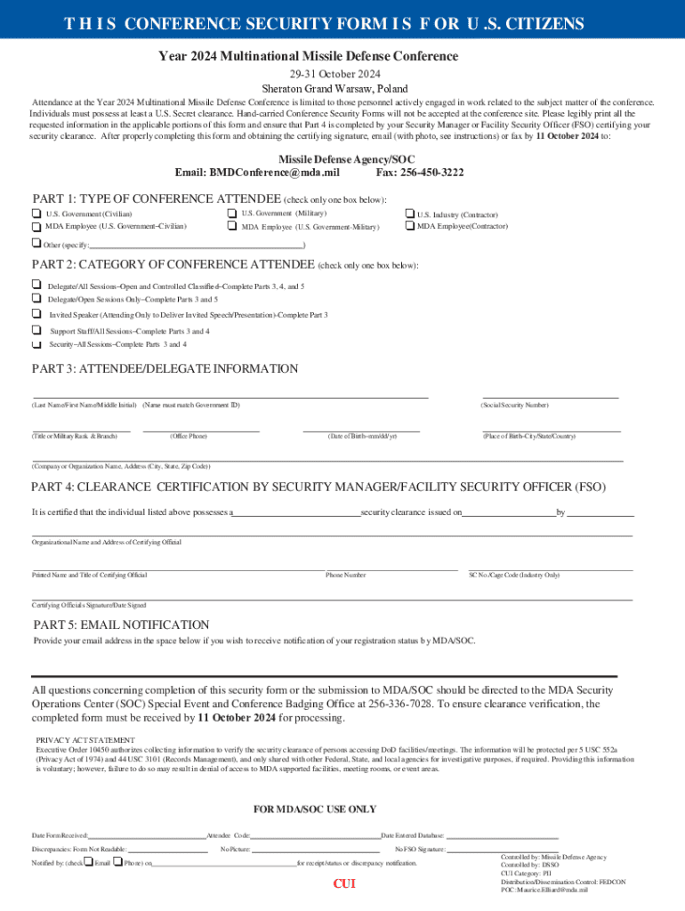 T H I S CONFERENCE SECURITY FORM I S F OR U .S. CITIZENS Year 2024 Multinational Missile Defense Conference 2931 October 2024 Sheraton Grand Warsaw, Poland Attendance at the Year 2024 Multinational