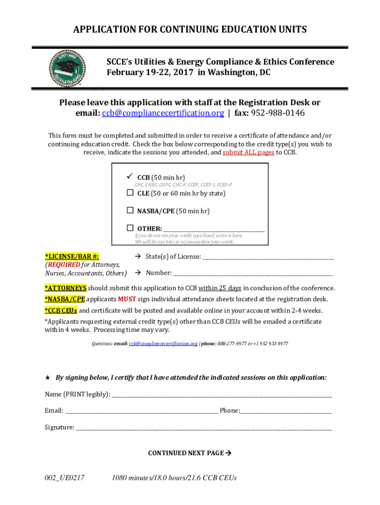 APPLICATION FOR CONTINUING EDUCATION UNITS SCCEs Utilities & Energy Compliance & Ethics Conference February 1922, 2017 in Washington, DC Please leave this application with staff at the Registration