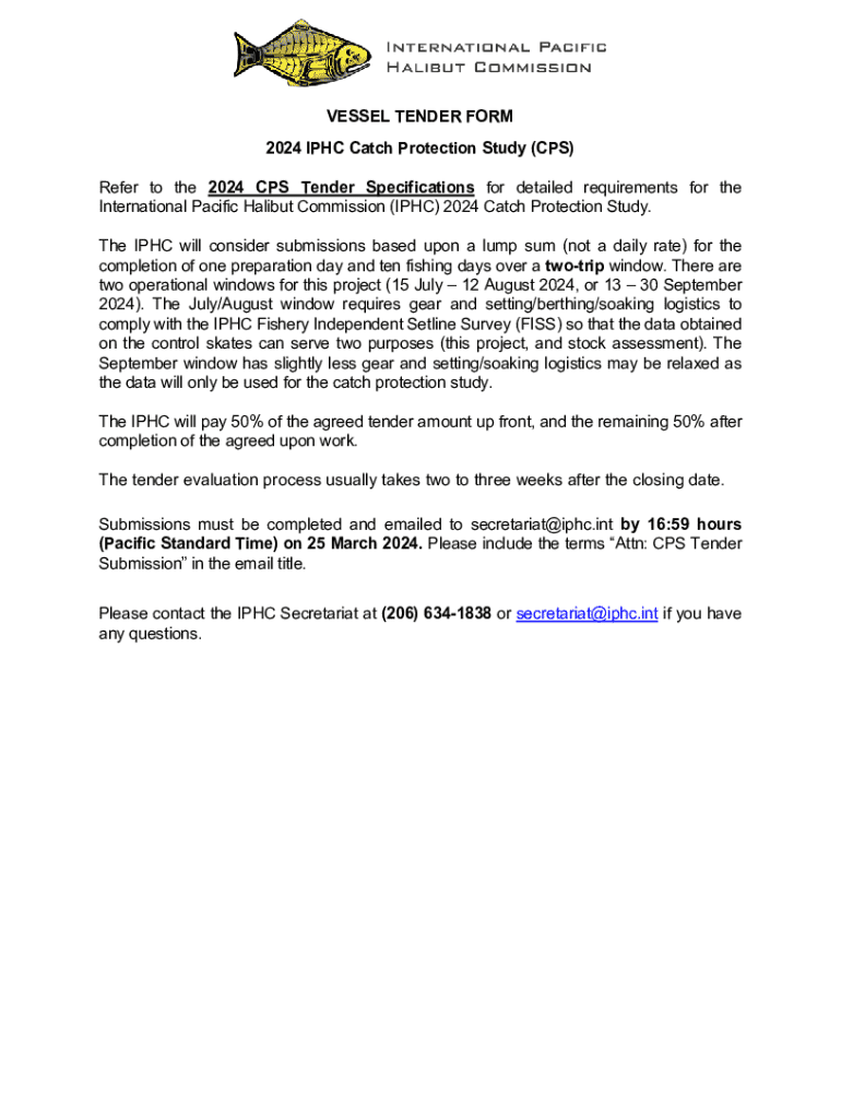 VESSEL TENDER FORM 2024 IPHC Catch Protection Study (CPS) Refer to the 2024 CPS Tender Specifications for detailed requirements for the International Pacific Halibut Commission (IPHC) 2024 Catch Protection