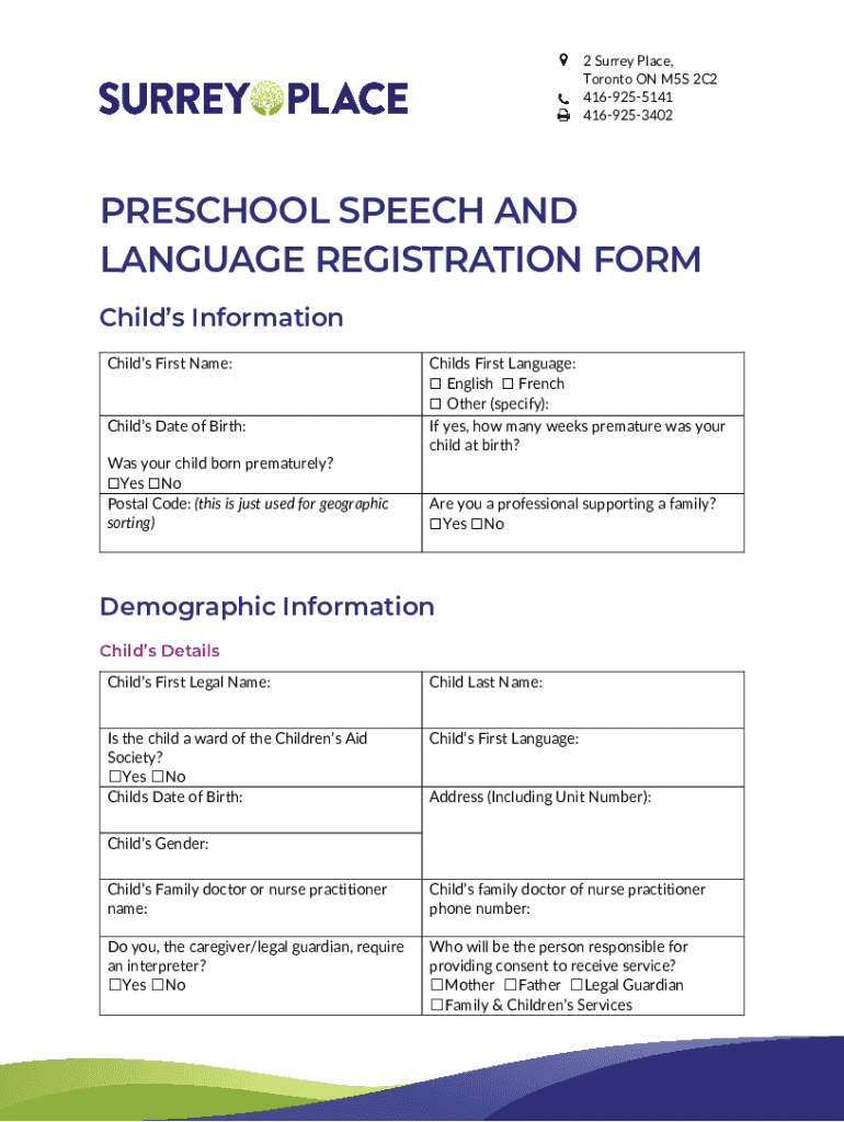 2 Surrey Place, Toronto ON M5S 2C2 4169255141 4169253402PRESCHOOL SPEECH AND LANGUAGE REGISTRATION FORM Childs Information Childs First Name:Childs Date of Birth: Was your child born prematurely?