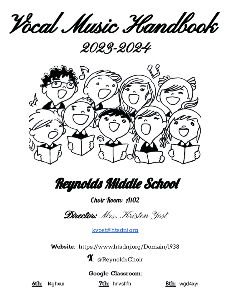 Vocal Music Handbook 20232024Reynolds Middle School Choir Room: A102Director: Mrs. Kristen Yost kyost@htsdnj.org Website: https://www.htsdnj.org/Domain/1938X: 6th:l4ghxui@ReynoldsChoirGoogle Classroom: