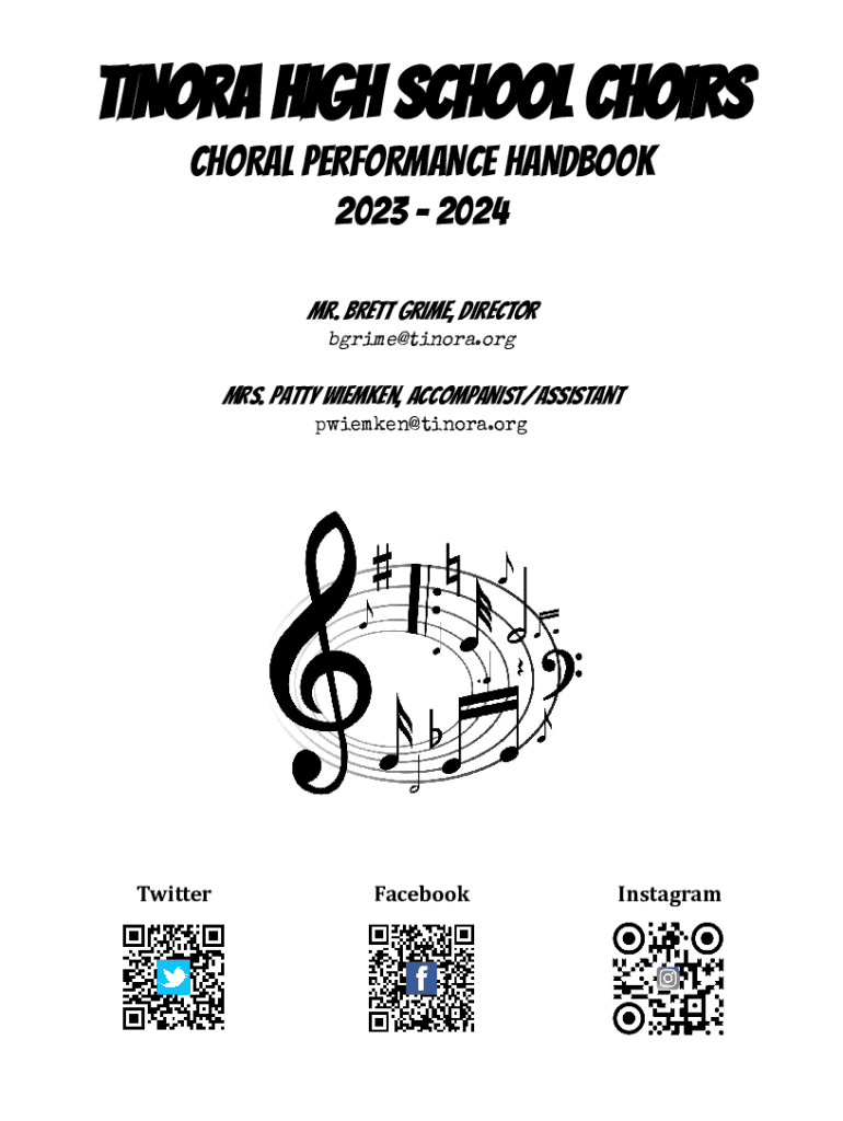 TINORA HIGH SCHOOL CHOIRS CHORAL PERFORMANCE HANDBOOK 2023 2024 Mr. Brett Grime, Director bgrime@tinora.orgMrs. Patty Wiemken, Accompanist/Assistant pwiemken@tinora.orgTwitterFacebookInstagramI: Choir