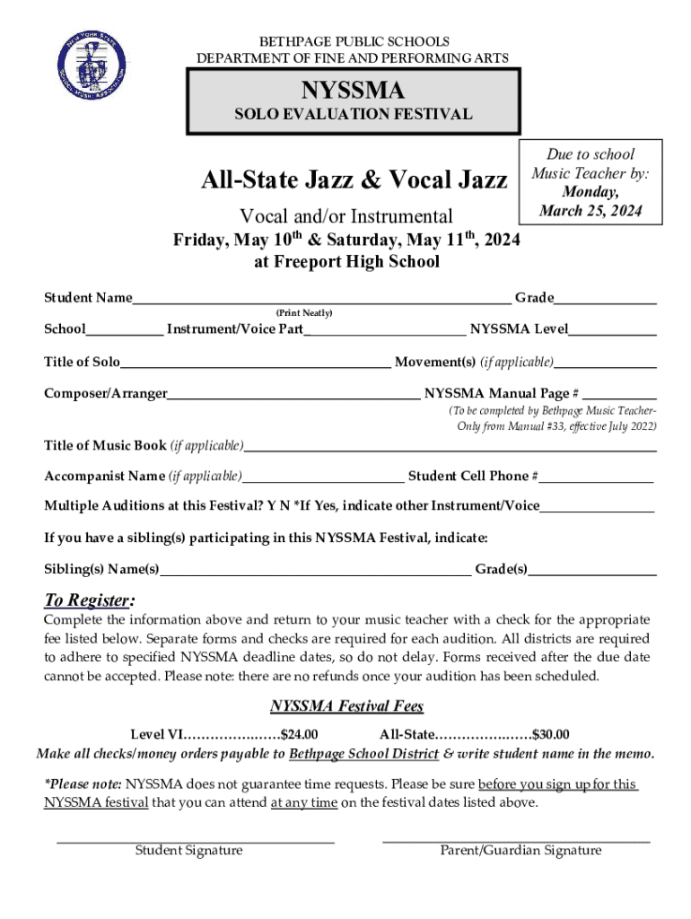 Get the free Bethpage musicians earn NYSSMA All-State honors