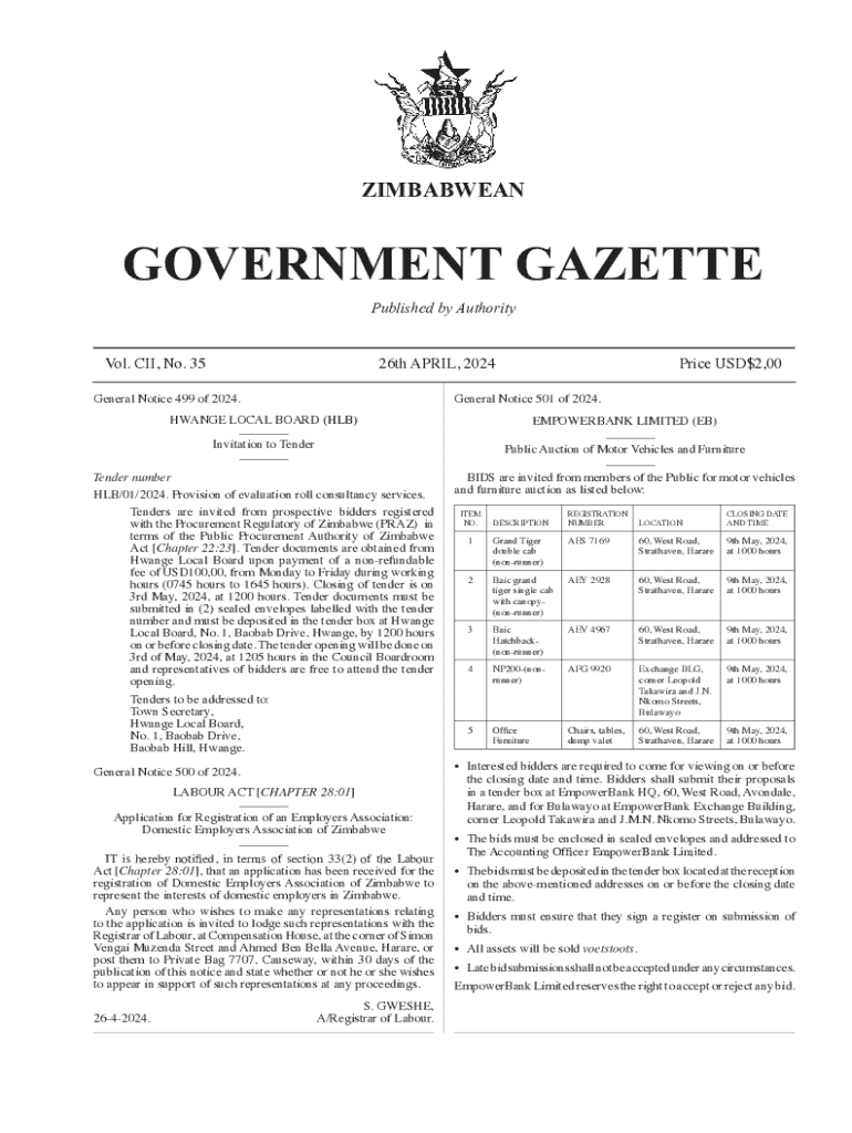 Zimbabwean Government Gazette, 26th April, 2024695ZIMBABWEANGOVERNMENT GAZETTE