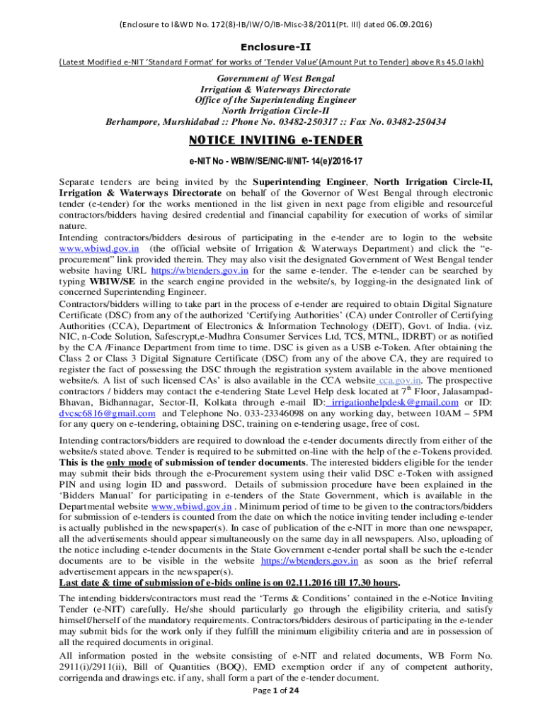 (Enclosure to I&WD No. 172(8)IB/IW/O/IBMisc38/2011(Pt. III) dated 06.09.2016)EnclosureII (Latest Modified eNIT Standard Format for works of Tender Value(Amount Put to Tender) above Rs 45.0 lakh)Government