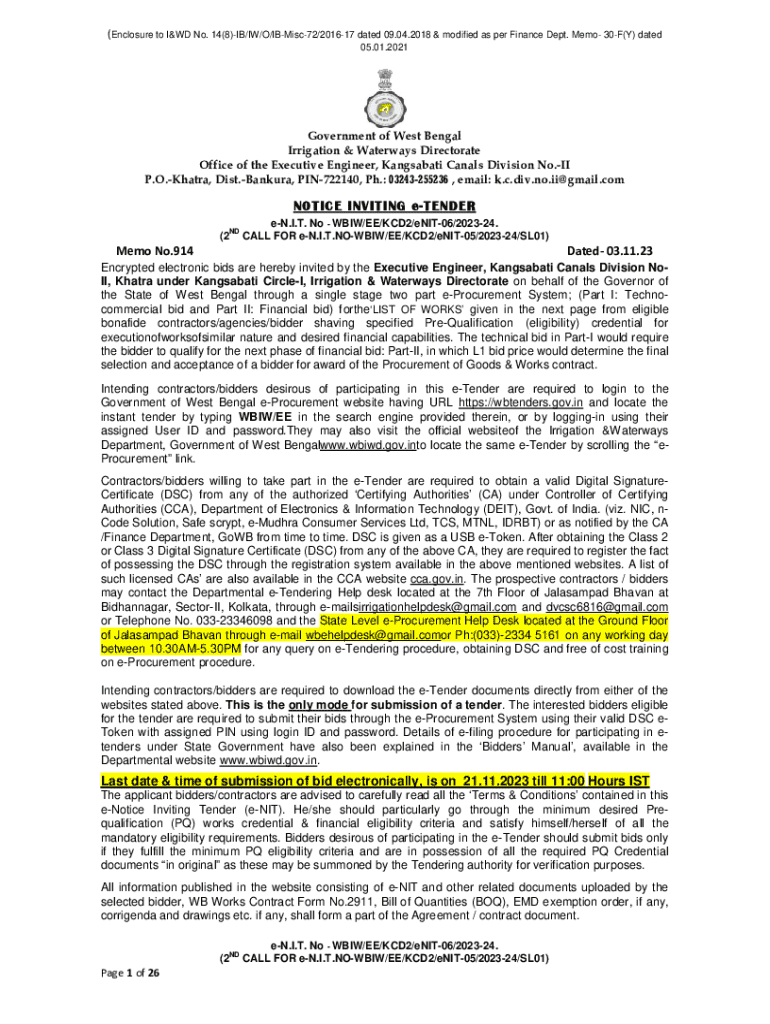 Get the free NOTICE INVITING e-TENDER Memo No.914 Dated - wbiwd gov