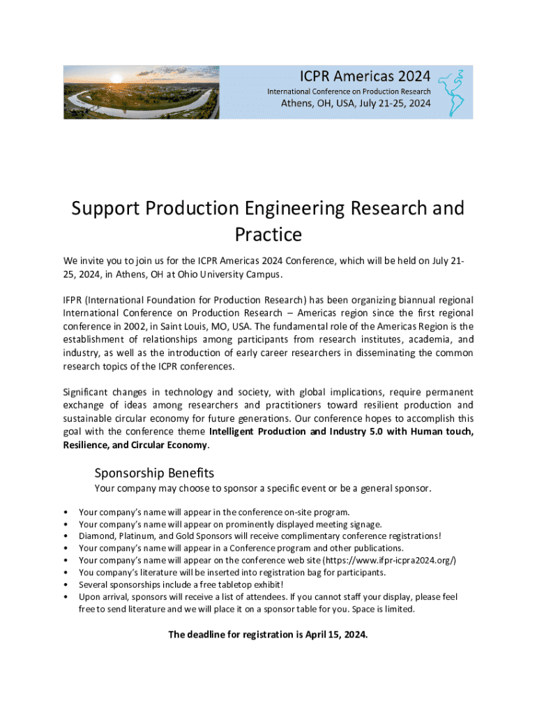 Support Production Engineering Research and Practice We invite you to join us for the ICPR Americas 2024 Conference, which will be held on July 2125, 2024, in Athens, OH at Ohio University Campus.