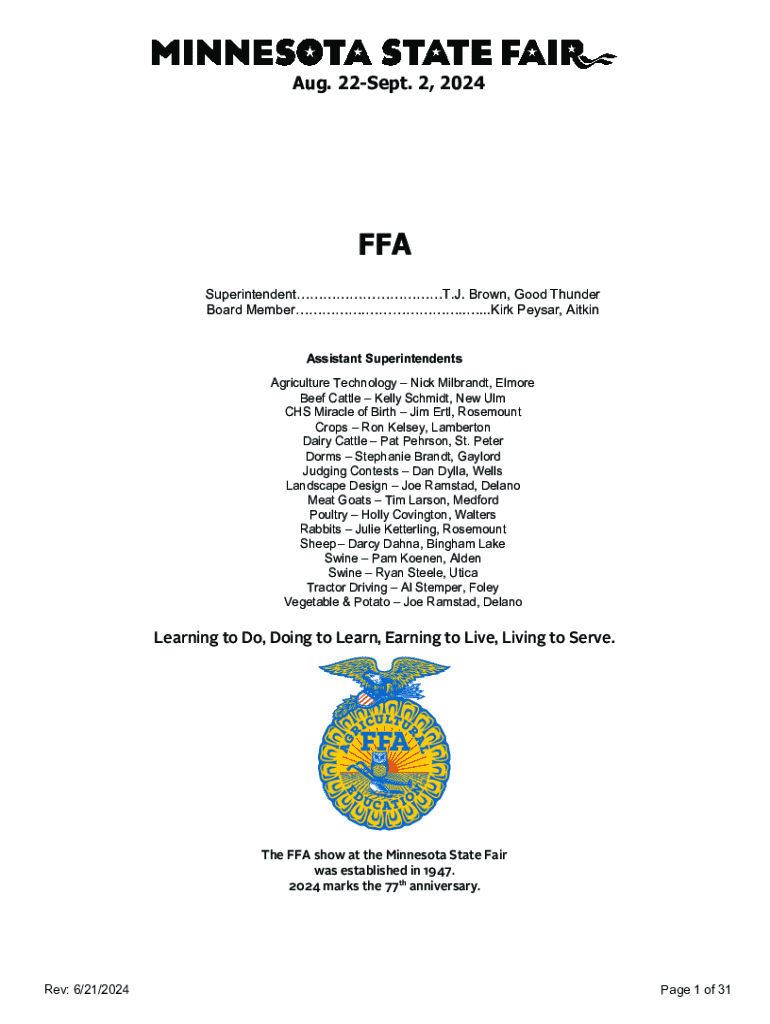 Aug. 22Sept. 2, 2024FFA Superintendent. J. Brown, Good Thunder Board Member...... Kirk Paar, AitkinAssistant Superintendents Agriculture Technology Nick Migrant, Elmore Beef Cattle Kelly Schmidt,