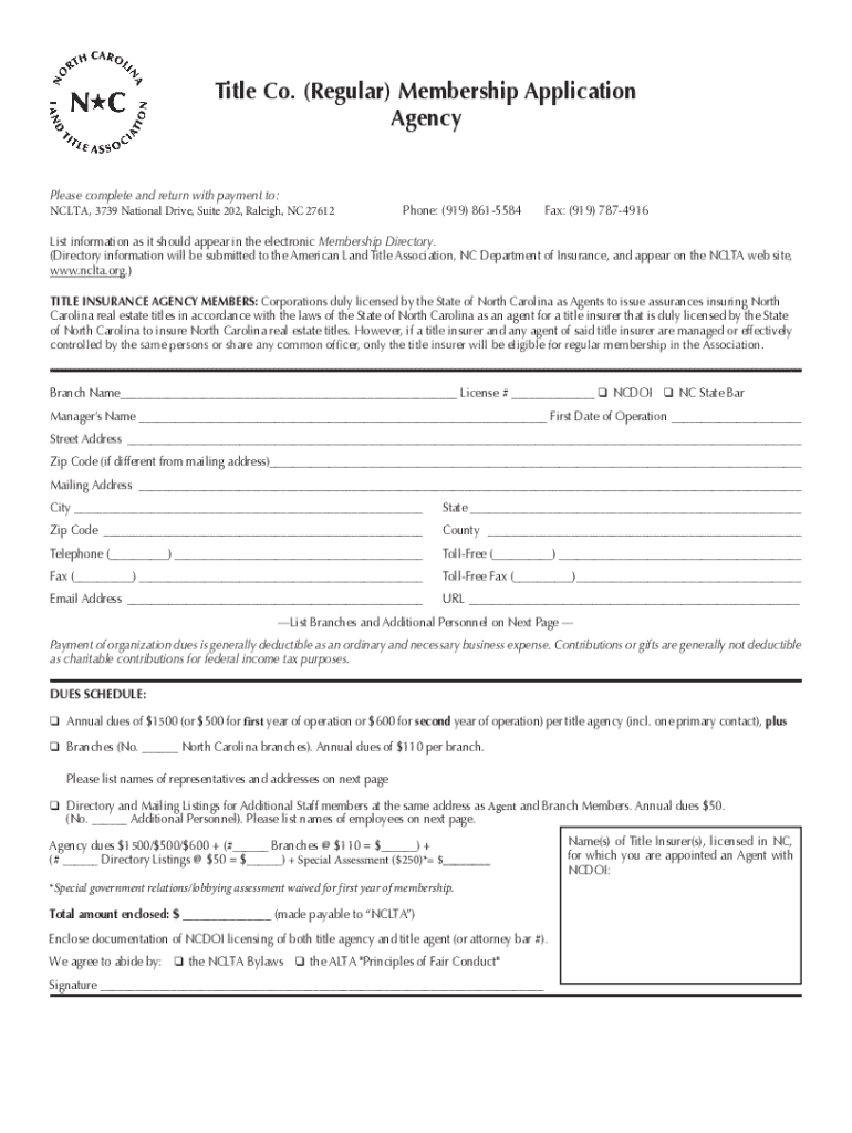 Title Co. (Regular) Membership Application Agency Phone: (919) 8615584Fax: (919) 7874916List information as it should appear in the electronic Membership Directory. (Directory information will be