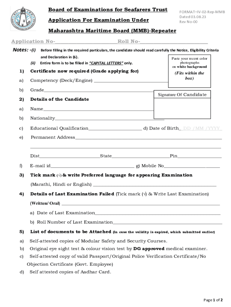 Board of Examinations for Seafarers TrustFORMATIV02RepMMB Dated 03.08.23 Rev No00Application For Examination Under Maharashtra Maritime Board (MMB)RepeaterApplication No___Roll No___Notes: (i)Before