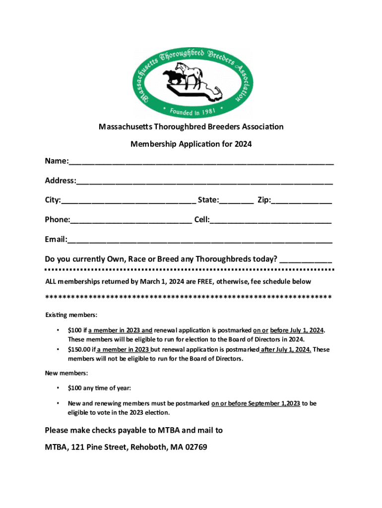 Massachusetts)s Thoroughbred Breeders Associa3on Membership Applica3on for 2024 Name:___ Address:___ City:___ State:___ Zip:___ Phone:___ Cell:___ Email:___ Do you currently Own, Race or Breed any