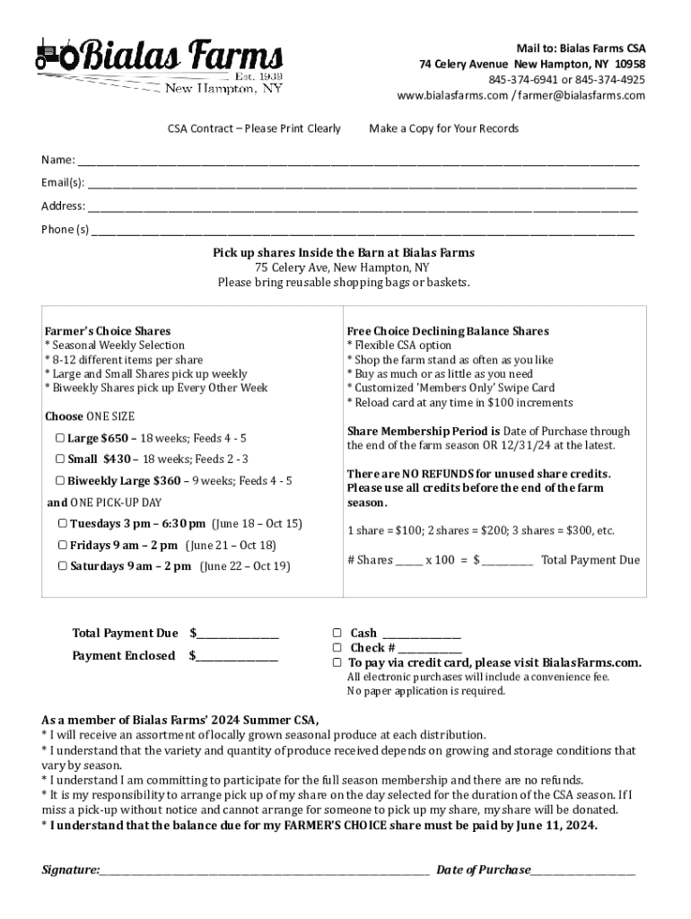 Bialas Farms CSA 74 can be filled out online or submitted via mail.