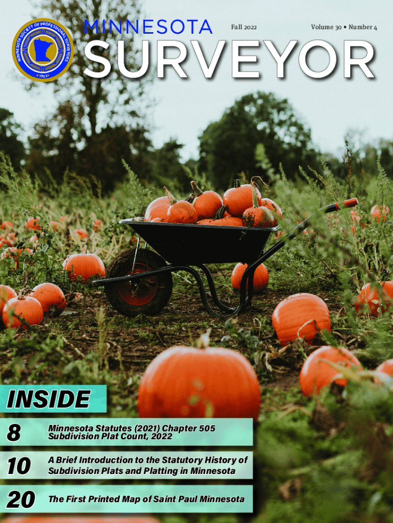 OCF PROFES SIOFall 2022Volume 30 Number 4URVEYORS LSNESOTA M IN SYONAT IE1953INSIDE 8 10 20Minnesota Statutes (2021) Chapter 505 Subdivision Plat Count, 2022 A Brief Introduction to the Statutory