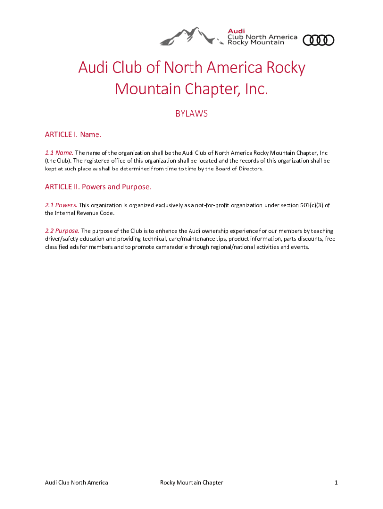 Audi Club of North America Rocky Mountain Chapter, Inc. BYLAWS ARTICLE I. Name. 1.1 Name. The name of the organization shall be the Audi Club of North America Rocky Mountain Chapter, Inc(the Club).
