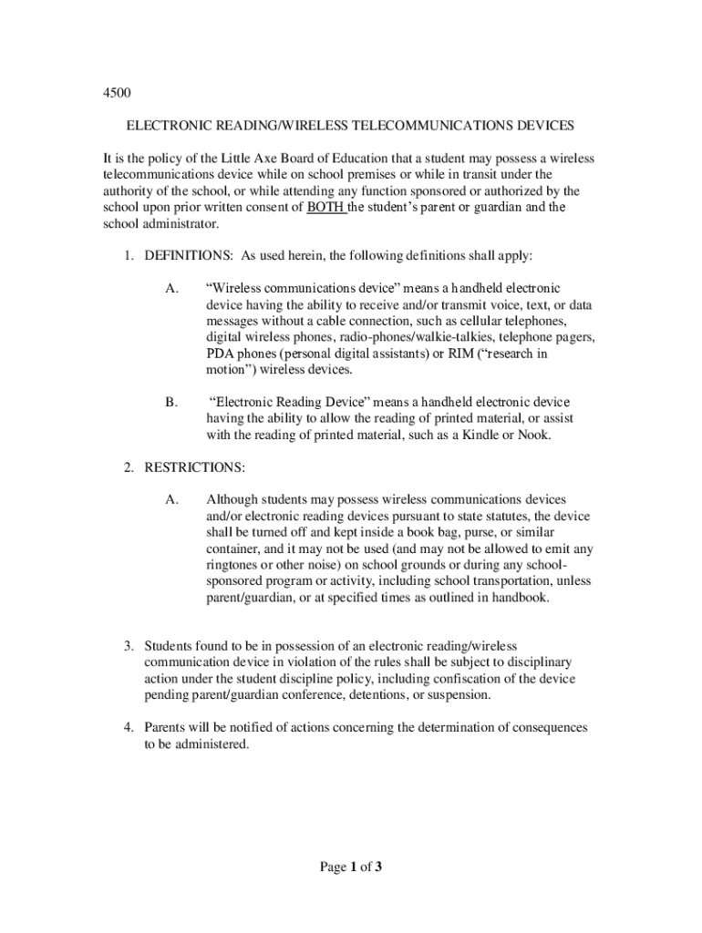 4500 ELECTRONIC READING/WIRELESS TELECOMMUNICATIONS DEVICES It is the policy of the Little Axe Board of Education that a student may possess a wireless telecommunications device while on school premises