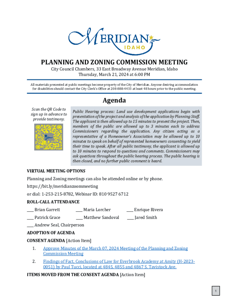PLANNING AND ZONING COMMISSION MEETING City Council Chambers, 33 East Broadway Avenue Meridian, Idaho Thursday, March 21, 2024 at 6:00 PM All materials presented at public meetings become property