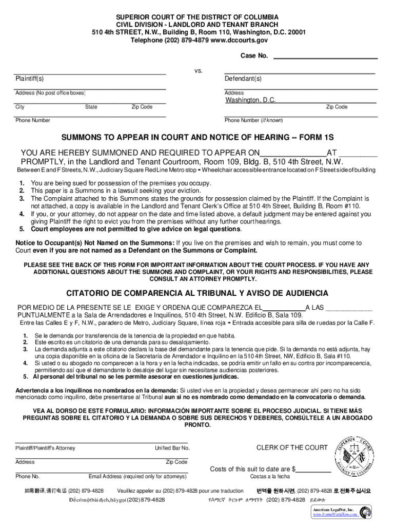 SUPERIOR COURT OF THE DISTRICT OF COLUMBIA CIVIL DIVISION LANDLORD AND TENANT BRANCH 510 4th STREET, N.W., Building B, Room 110, Washington, D.C. 20001 Telephone (202) 8794879 www.dccourts.gov Case