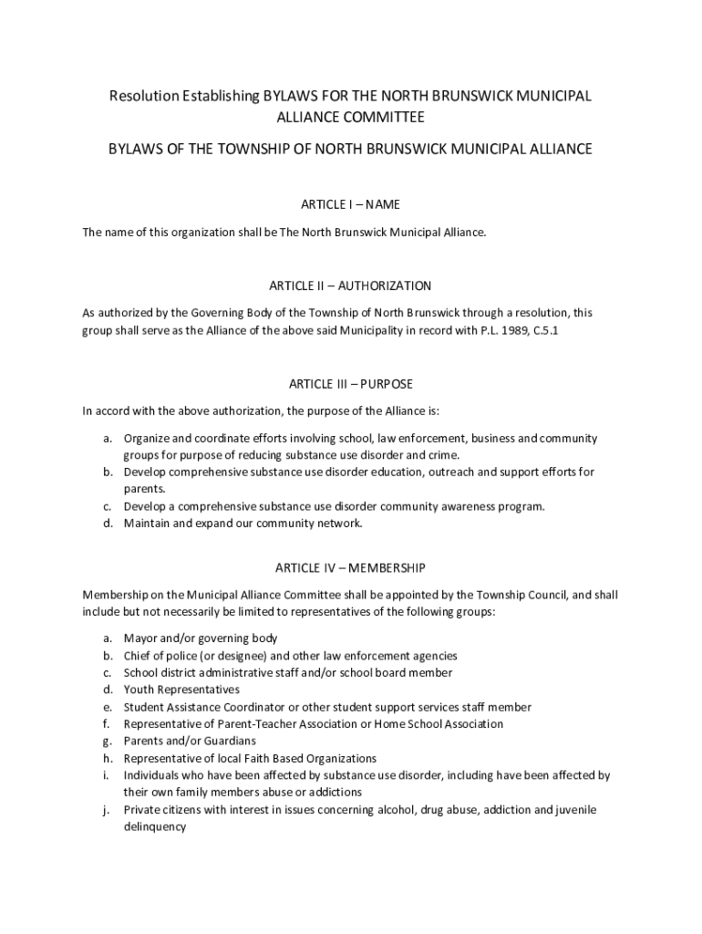 Resolution Establishing BYLAWS FOR THE NORTH BRUNSWICK MUNICIPAL ALLIANCE COMMITTEE BYLAWS OF THE TOWNSHIP OF NORTH BRUNSWICK MUNICIPAL ALLIANCE ARTICLE I NAME The name of this organization shall