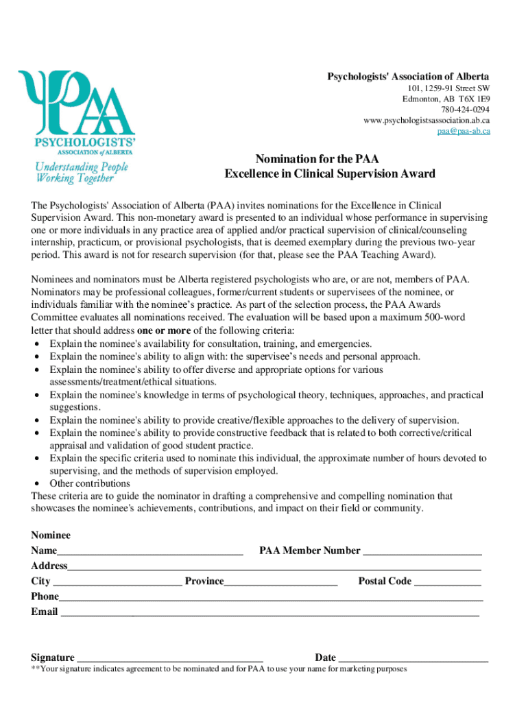 Get the free Nomination for the PAA Excellence in Clinical Supervision ...