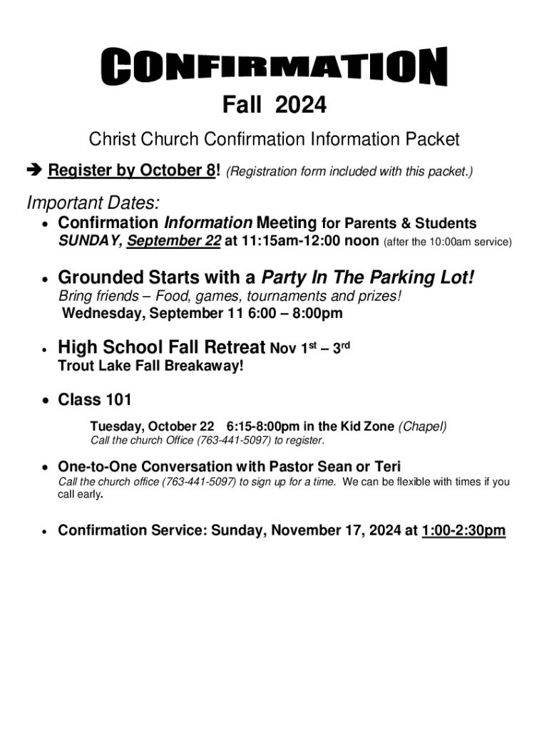 Fall 2024 Christ Church Confirmation Information Packet Register by October 8! (Registration form included with this packet.) Important Dates: Confirmation Information Meeting for Parents & Students