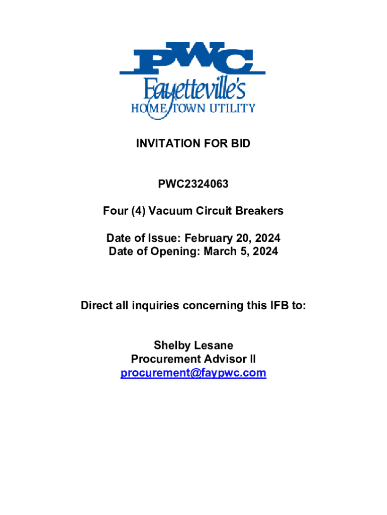 INVITATION FOR BID PWC2324063 Four (4) Vacuum Circuit Breakers Date of Issue: February 20, 2024 Date of Opening: March 5, 2024Direct all inquiries concerning this IFB to: Shelby Lesane Procurement