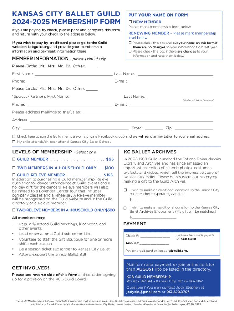 KANSAS CITY BALLET GUILD 20242025 MEMBERSHIP FORM If you are paying by check, please print and complete this form and return with your check to the address below. If you wish to pay by credit card