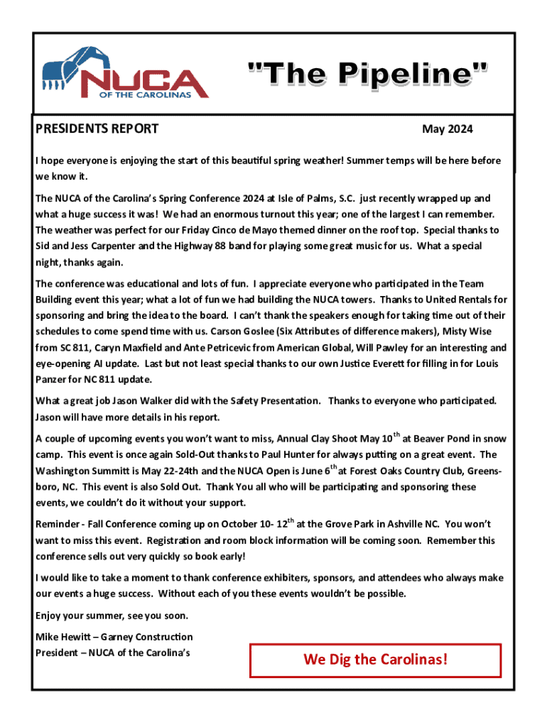 PRESIDENTS REPORTMay 2024I hope everyone is enjoying the start of this beautiful spring weather! Summer temps will be here before we know it. The NUCA of the Carolinas Spring Conference 2024 at Isle
