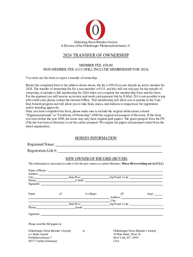 Oldenburg Horse Breeders Society A Division of the Oldenburger Pferdezuchtverband e.V.2024 TRANSFER OF OWNERSHIP MEMBER FEE: 50.00 NONMEMBER FEE: 115 (WILL INCLUDE MEMBERSHIP FOR 2024) You must use