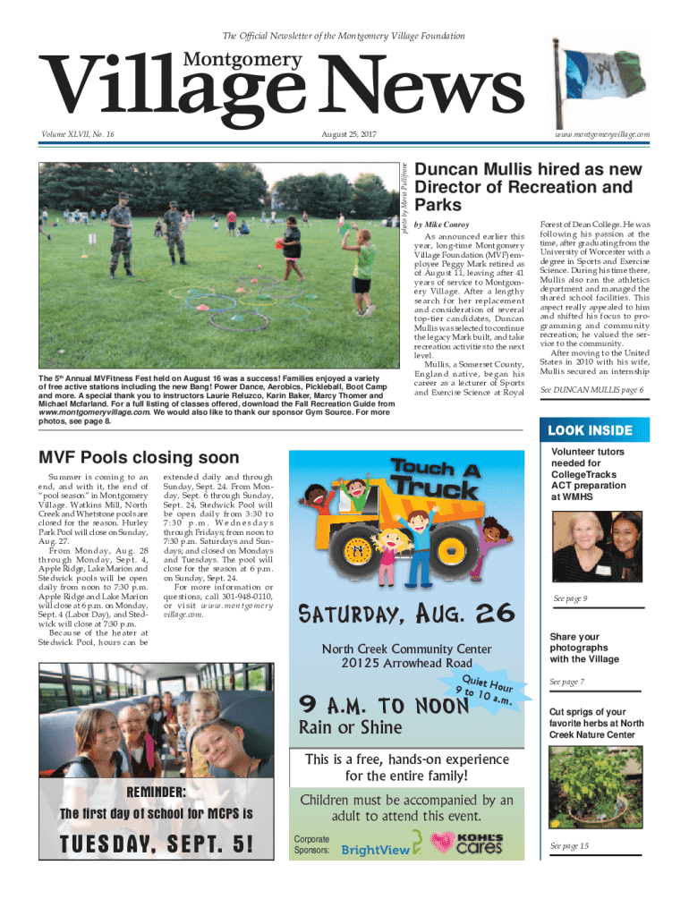 The Official Newsletter of the Montgomery Village FoundationVillage News MontgomeryVolume CLVII, No. 16photo by Maria PullifroneAugust 25, 2017The 5th Annual Fitness Fest held on August 16 was a success!