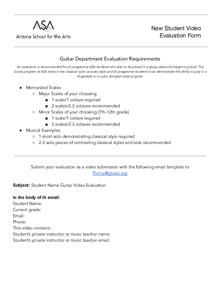 New Student Video Evaluation FormGuitar Department Evaluation Requirements An evaluation is recommended for all prospective ASA students who wish to be placed in a group above the beginning level.