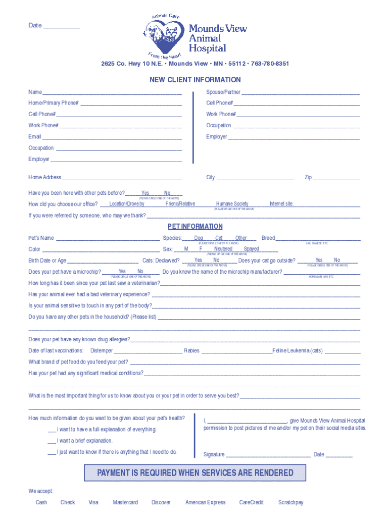 Date ___2625 Co. Hwy 10 N.E. Mounds View MN 55112 7637808351NEW CLIENT INFORMATION Name___Spouse/Partner___Home/Primary Phone#___Cell Phone#___Cell Phone#___Work Phone#___Work Phone#___Occupation___Email___Employer___Occupation___