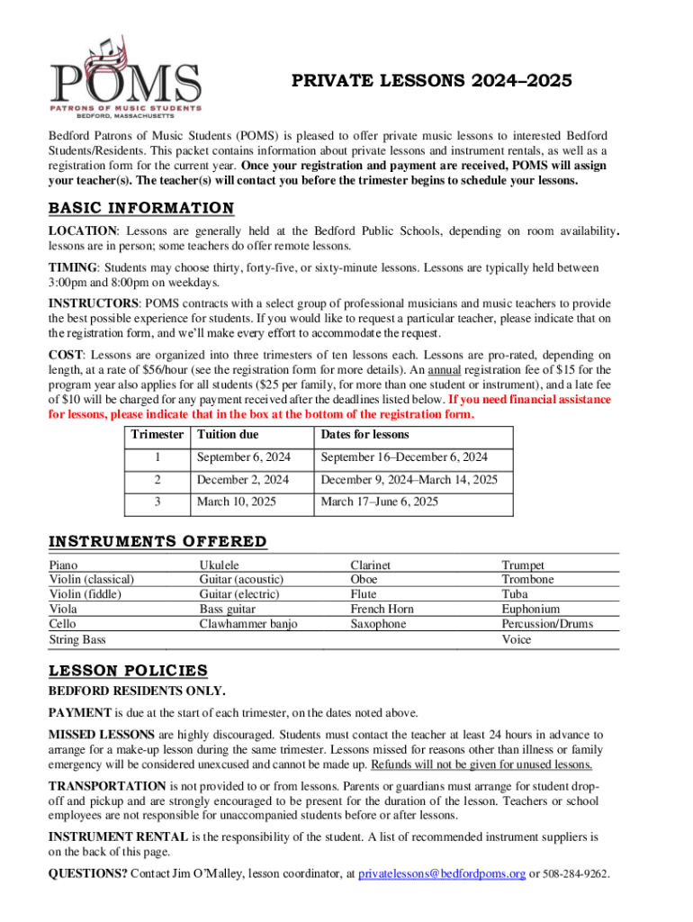 PRIVATE LESSONS 20242025 Bedford Patrons of Music Students (POMS) is pleased to offer private music lessons to interested Bedford Students/Residents. This packet contains information about private