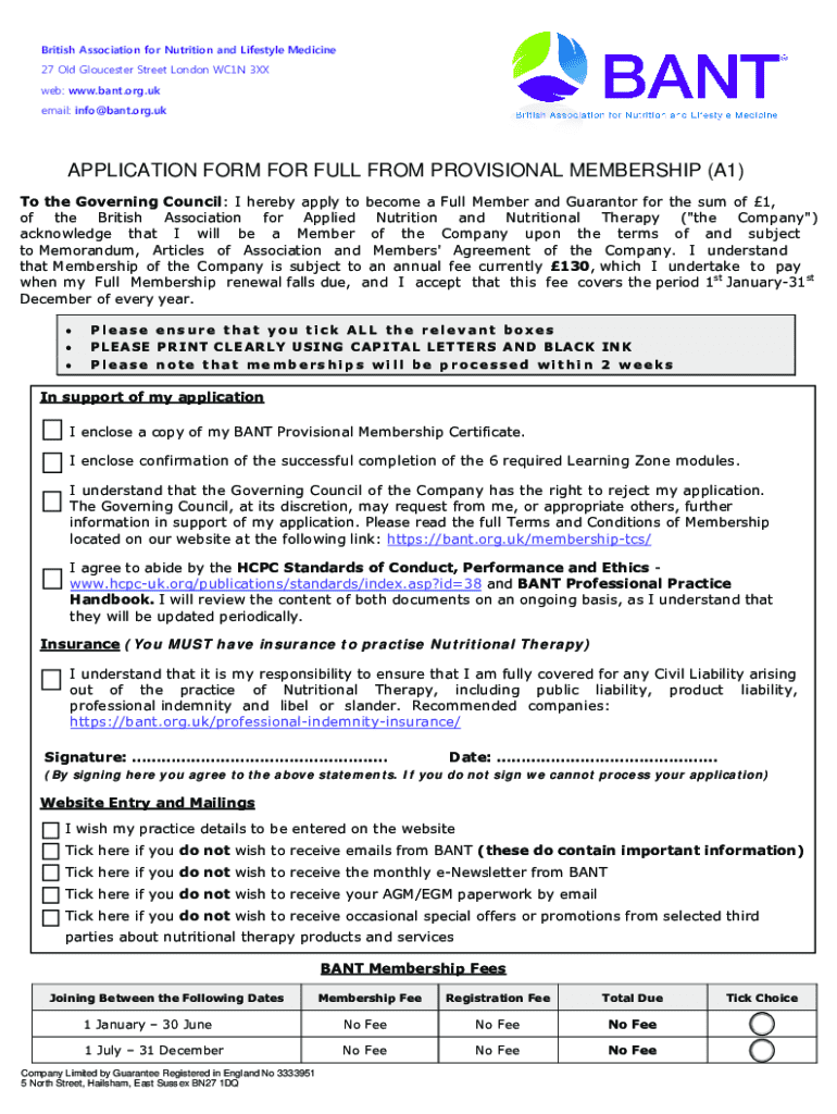 British Association for Nutrition and Lifestyle Medicine 27 Old Gloucester Street London WC1N 3XX web: www.bant.org.uk email: info@bant.org.ukAPPLICATION FORM FOR FULL FROM PROVISIONAL MEMBERSHIP