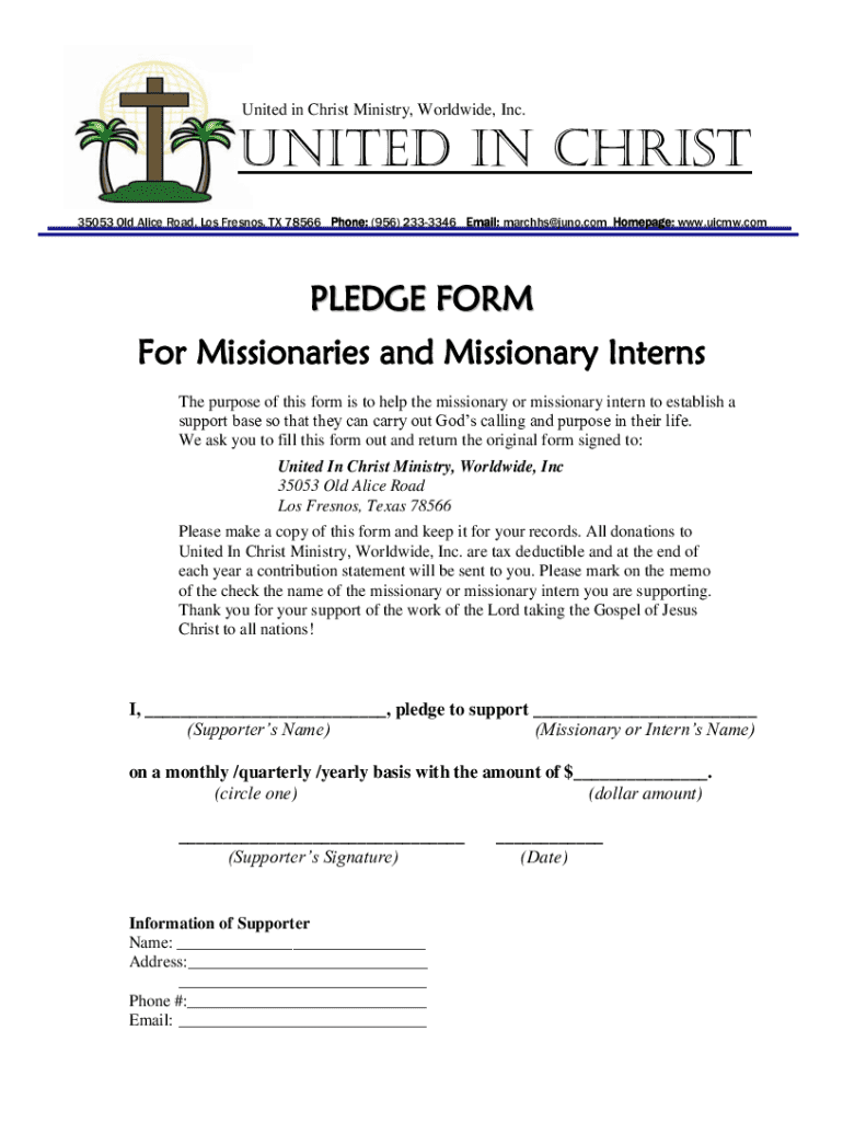 United in Christ Ministry, Worldwide, Inc.United in Christ ___ 35053 Old Alice Road, Los Fresnos, TX 78566 Phone: (956) 2333346 Email: marchhs@juno.com Homepage: www.uicmw.comPLEDGE FORM For Missionaries