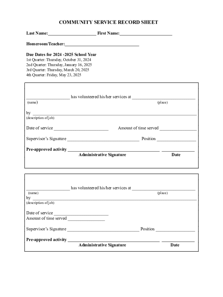 COMMUNITY SERVICE RECORD SHEET Last Name:___ First Name:___ Homeroom/Teacher:___ Due Dates for 2024 2025 School Year 1st Quarter: Thursday, October 31, 2024 2nd Quarter: Thursday, January 16, 2025
