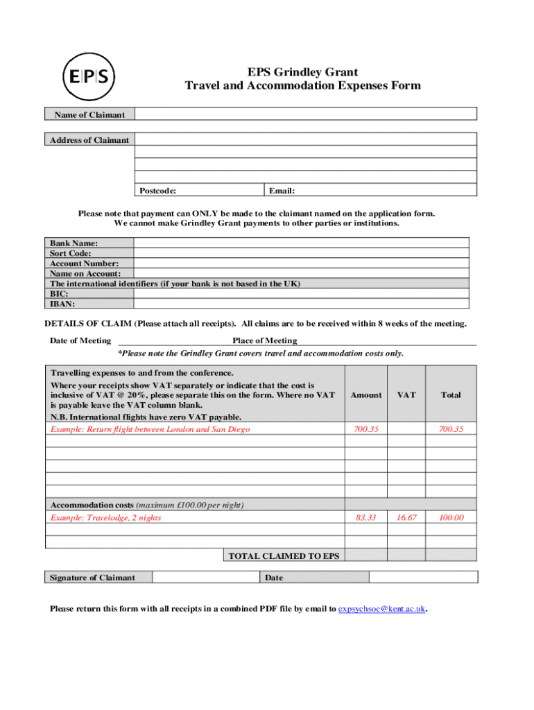 EPS Grindley Grant Travel and Accommodation Expenses Form Name of Claimant Address of ClaimantPostcode:Email:Please note that payment can ONLY be made to the claimant named on the application form.